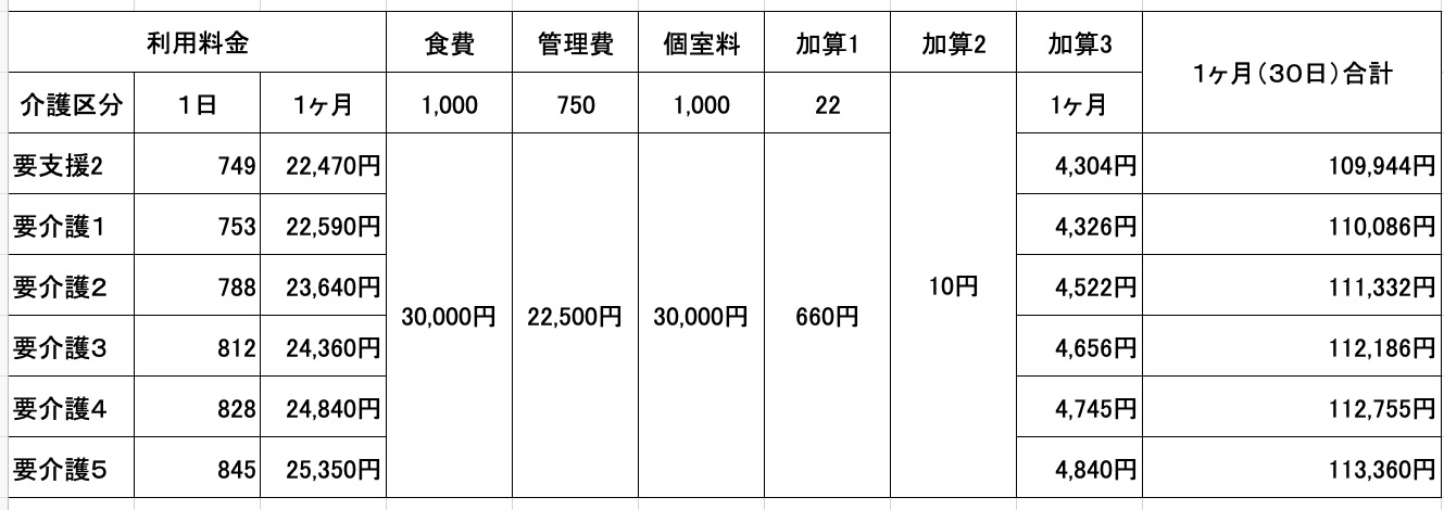 ※ 他 初期加算として 1日300円 介護保険対象ですので 一部負担で1日30円×30日=900円 入居開始後最初の30日のみ加算されます